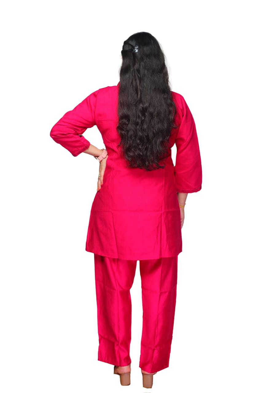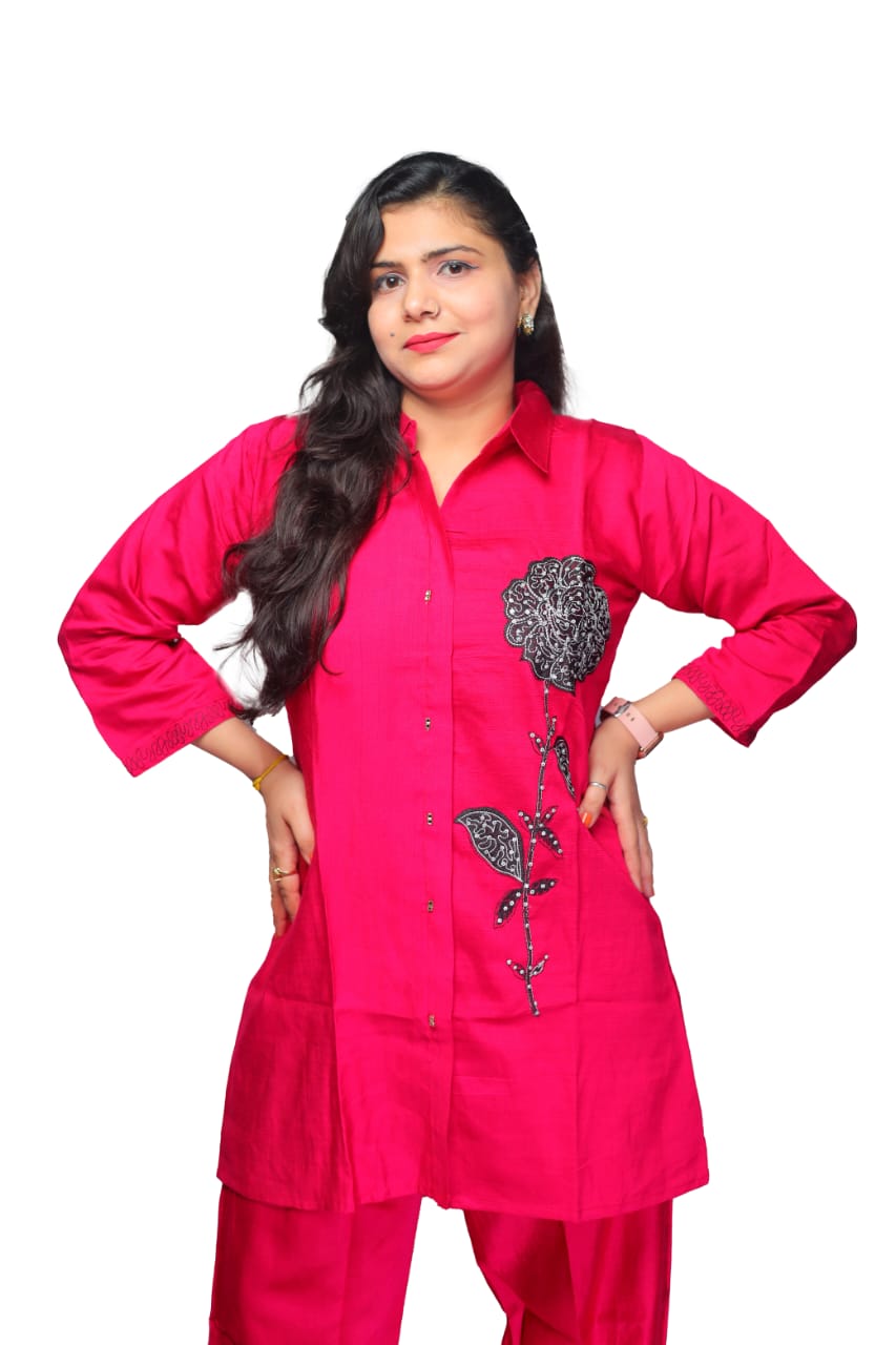 Meet the ultimate combo of style, comfort, and confidence. This vibrant pink co-ord set is designed to make a statement. Featuring a detailed floral embroidery, it brings a pop of color to your wardrobe with a touch of sophistication. Whether you're attending a casual day out or a laid-back evening gathering, this set offers the perfect balance of comfort and style.